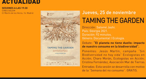 El jueves día 25 de noviembre a las 19:30 h. en los Cines GOLEM de Madrid hablaremos sobre pérdida de biodiversidad y economía junto a Ecologistas en Acción y no hay película más idónea que 'Taming the garden'