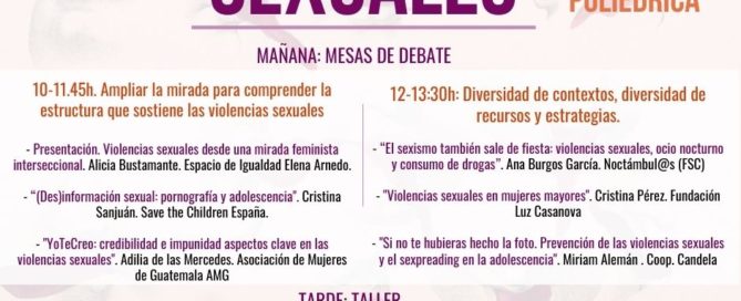 En colaboración con distintas organizaciones especializadas en género, proponemos una jornada de reflexión y acción en torno a las violencias sexuales. Jueves 26 de noviembre de 10:00 a 14:00h y 16:30 a 18:30h