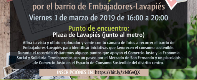 Este viernes 1 de marzo de 2019 nos vamos de safari fotográfico por el barrio. El punto de encuentro será la Plaza de Lavapiés (junto al metro) a las 16 h. Afina tu vista y olfato explorador, cálzate las botas y vente con tu cámara de fotos a recorrer el barrio de Embajadores-Lavapiés para identificar [...]